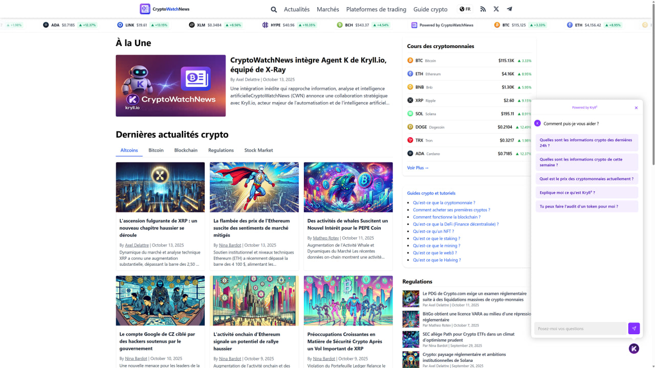 October 13, 2025 marks a new step for our AI Agent, now integrated into CryptoWatchNews, a multilingual media (EN/FR/ES) specialized in crypto news and trends. This presence further expands its reach after integrations on JournalDuCoin and CoinAcademy.