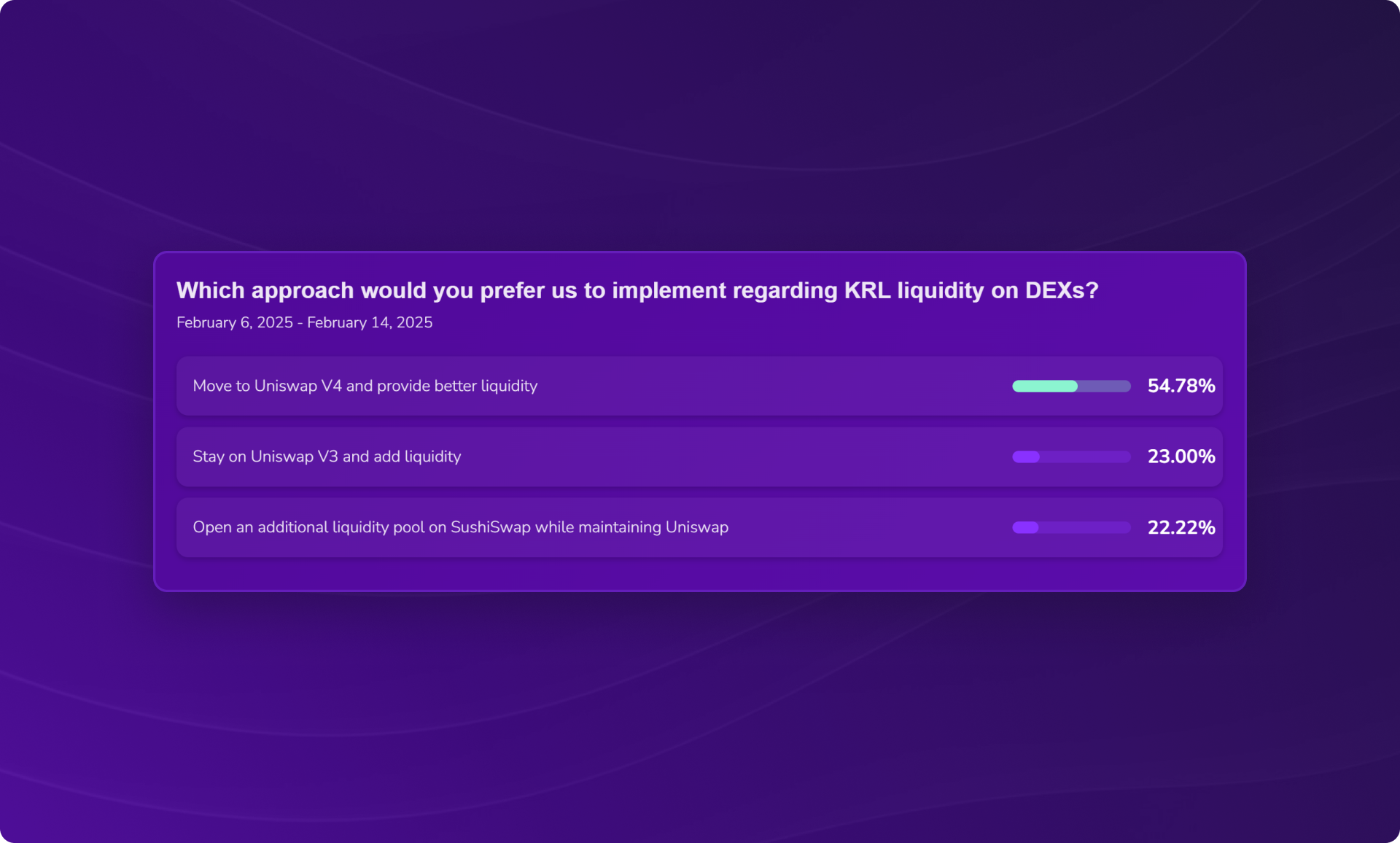 In early February, a new community vote defined the KRL liquidity strategy on DEXs. Users could distribute their 100 points among several strategies to guide our next actions.