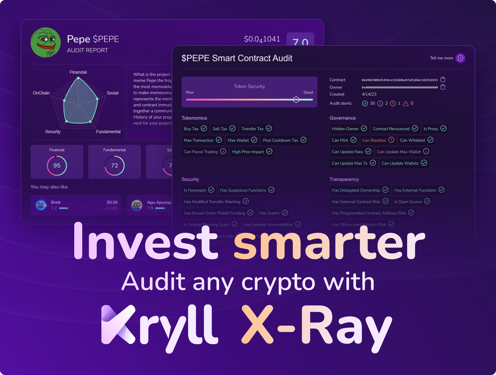 Kryll X-Ray helps you avoid traps in this token jungle. In seconds, you get a complete audit: smart contract analysis, on-chain data, financial metrics, and social signals. The tool automatically detects red flags (trapped contracts, unlimited mint, excessive holder concentration) that could cost you dearly in the heat of the moment.
