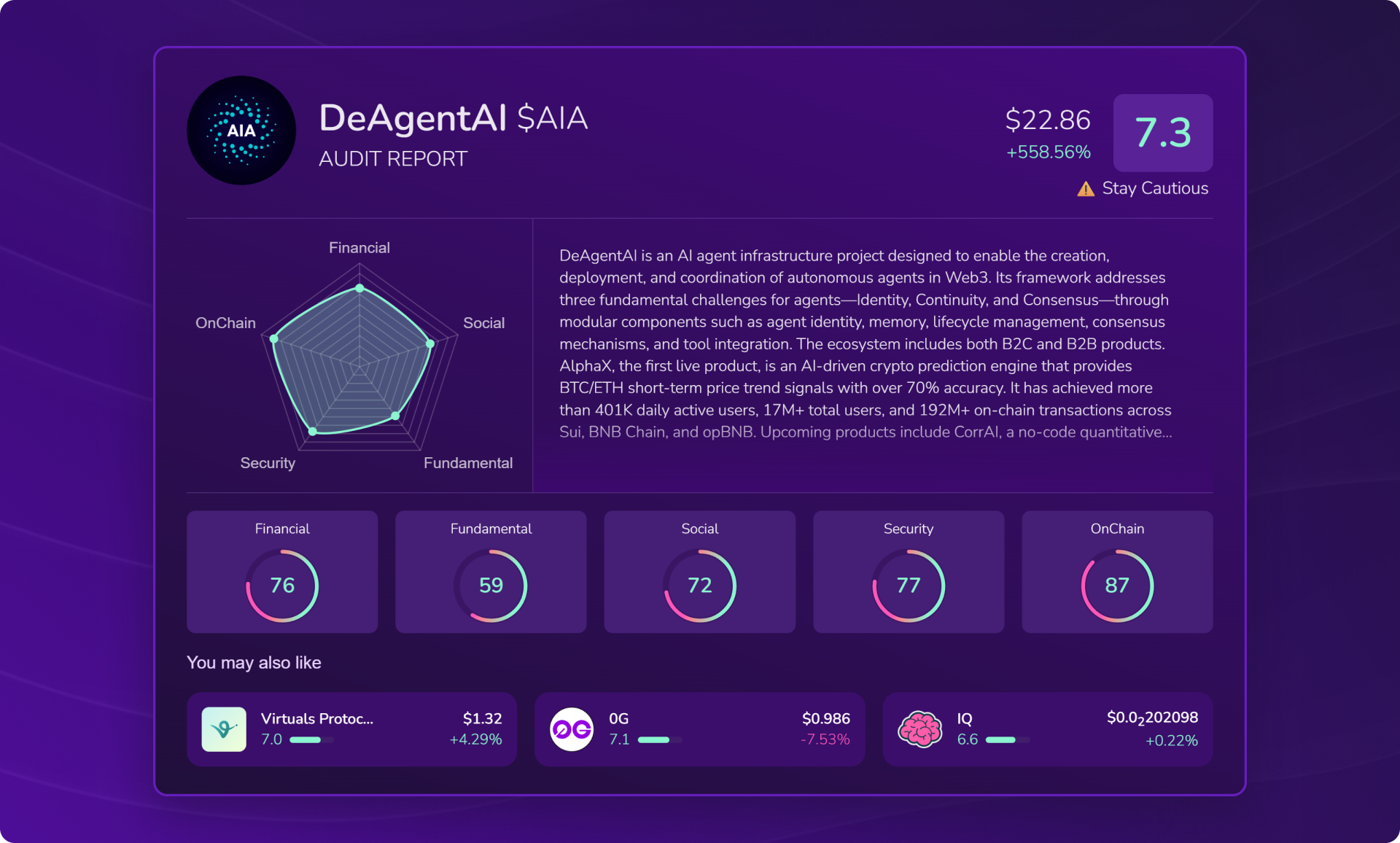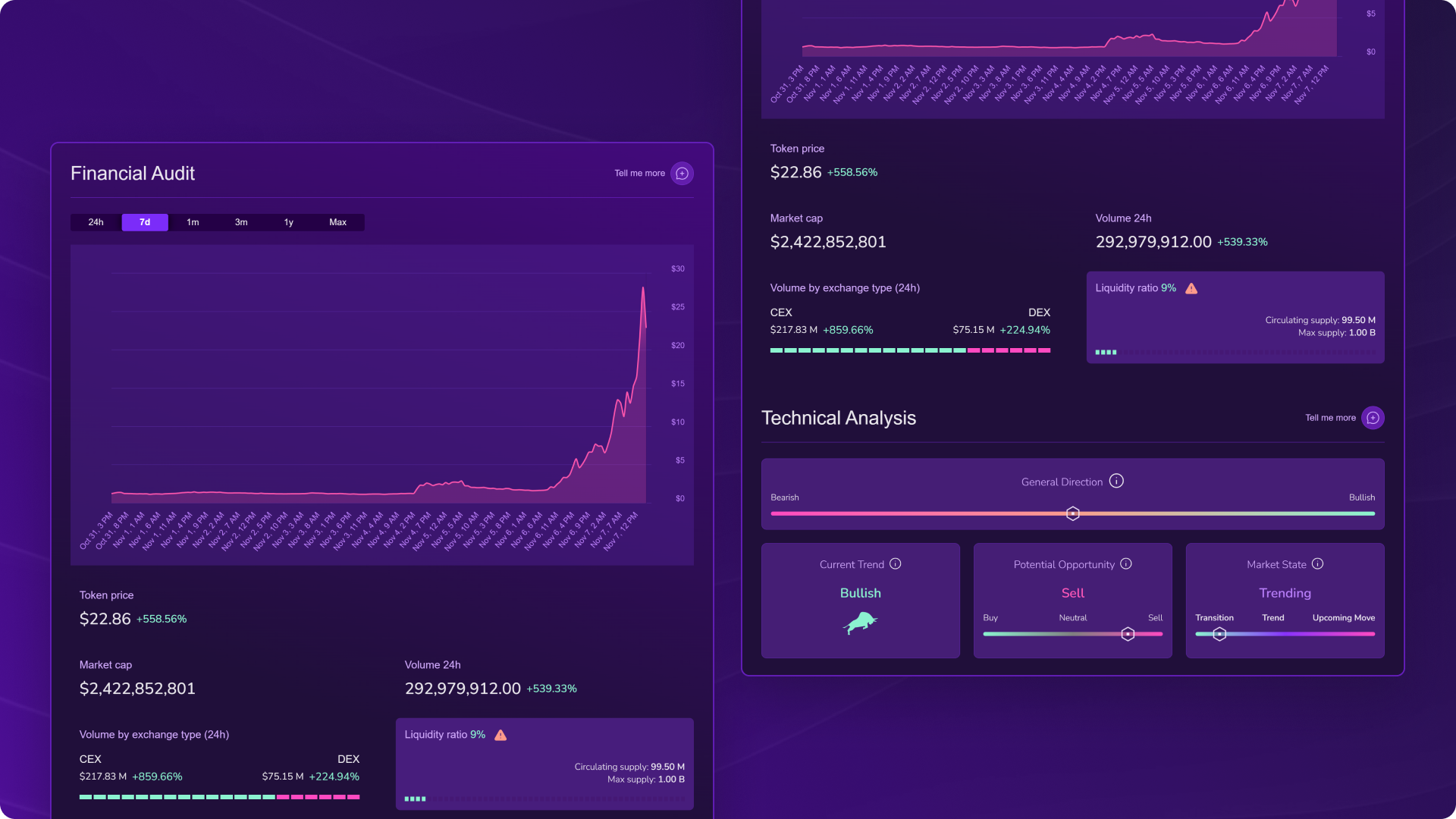 - ⚡ Instant complete audit: Get a clear overview of a token in seconds: smart contract, on-chain data, financial metrics, and social signals all in one place.