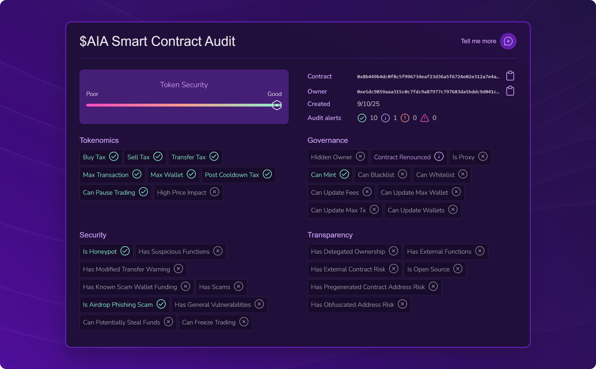 👉 In summary: The $AIA smart contract is clean, stable, and without major warning signs. No element suggests a dangerous or fraudulent mechanism.