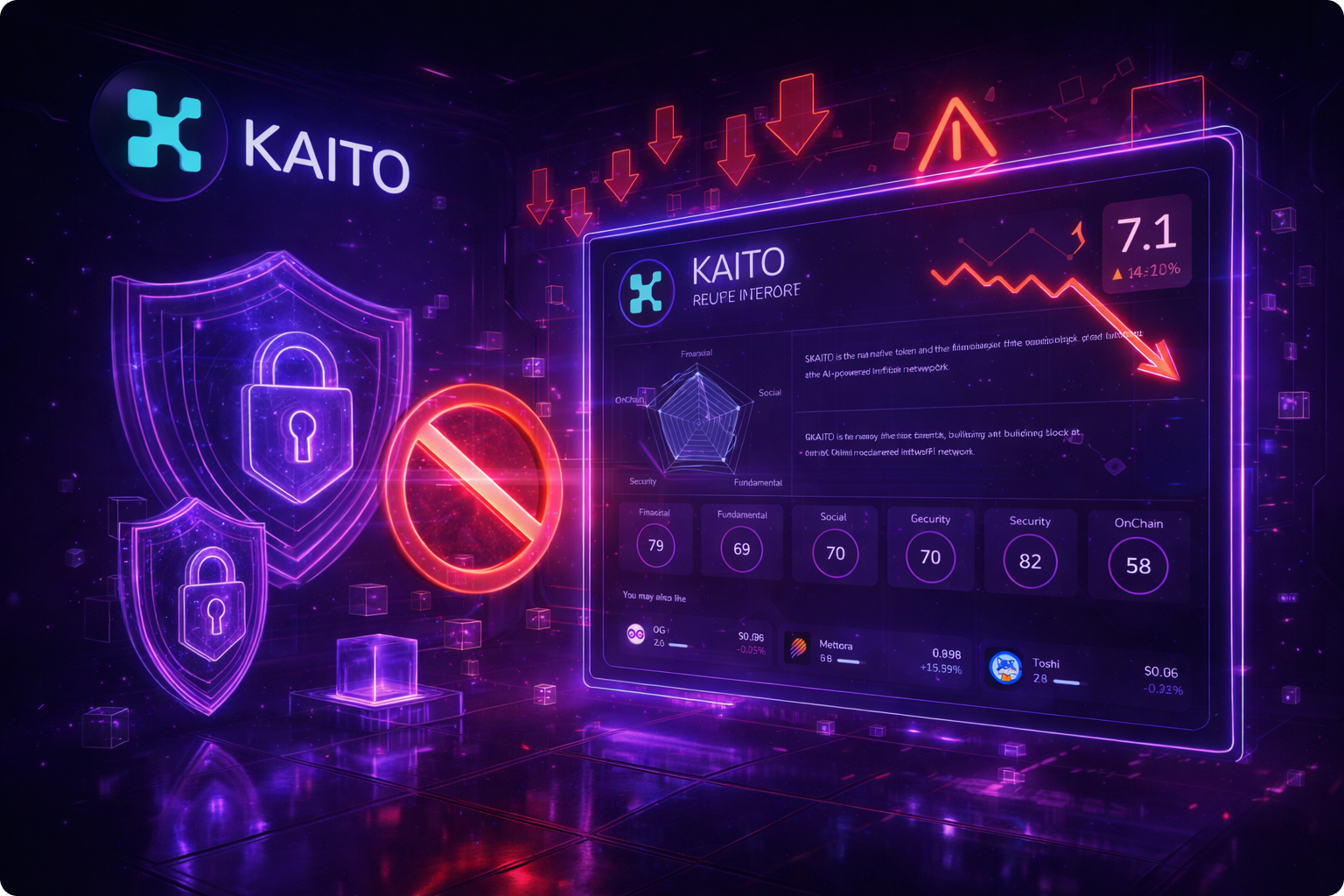 Kaito se présente comme un token “InfoFi”, un segment où la valeur se construit autant par l’attention et la distribution que par la tech pure. Le dashboard X-Ray montre un profil paradoxal mais assez typique de cette catégorie : des signaux solides sur la sécurité (82/100), une activité de marché énorme (volumes 24h en explosion) et une traction sociale réelle, tout en affichant des fragilités très concrètes quand le marché passe en mode panique.
