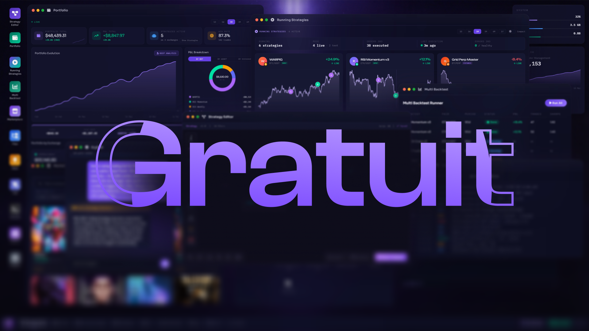 Le logiciel tourne sur votre machine. Vos clés API y restent. Votre capital ne transite à aucun moment par nos serveurs, et nous n'avons pas accès à vos fonds. Prélever une commission sur vos transactions nous serait techniquement impossible. Les profits générés par une stratégie vous reviennent donc en totalité, et cela ne dépend d'aucune décision de notre part, c'est l'architecture du produit qui le garantit.