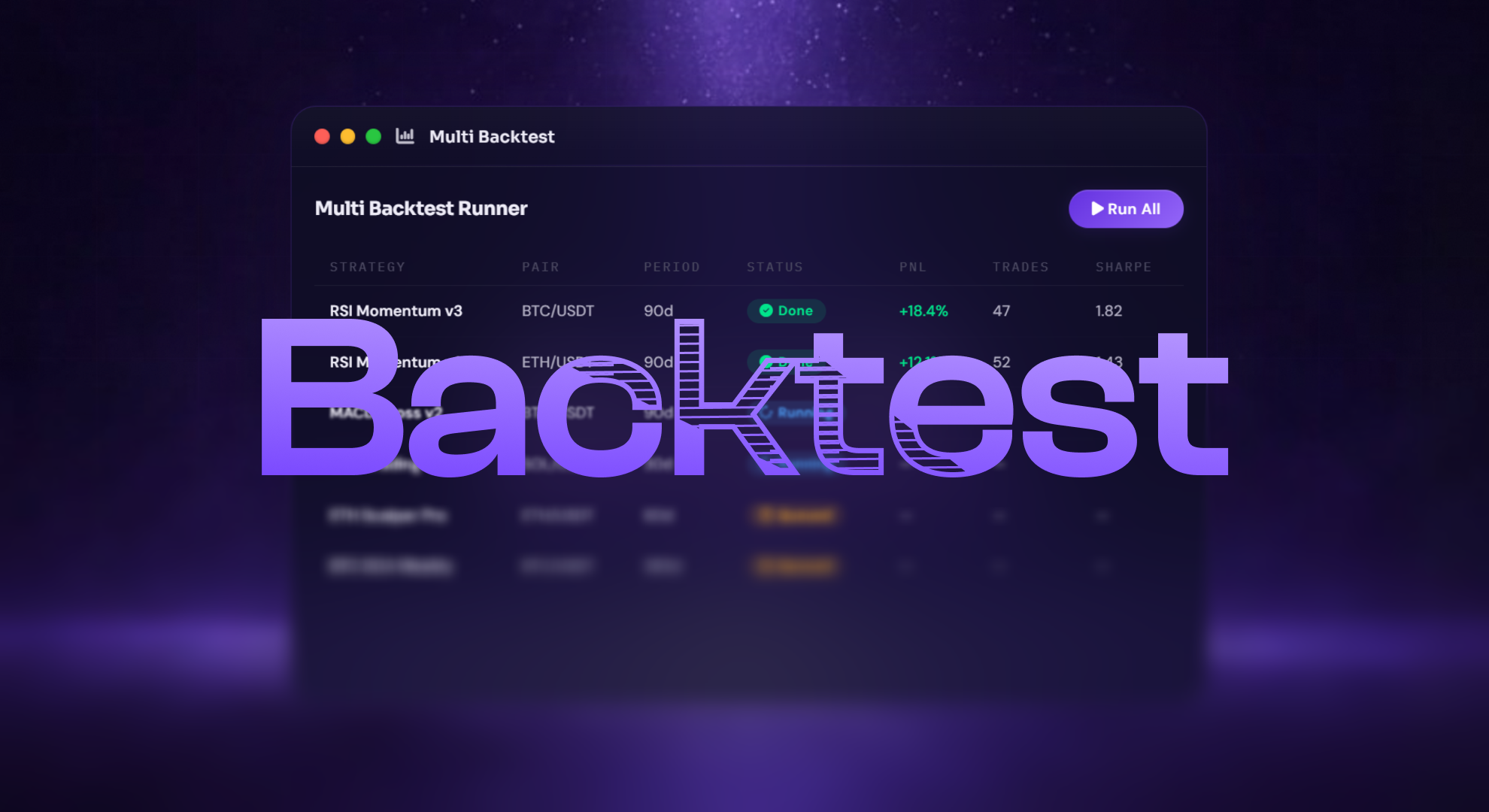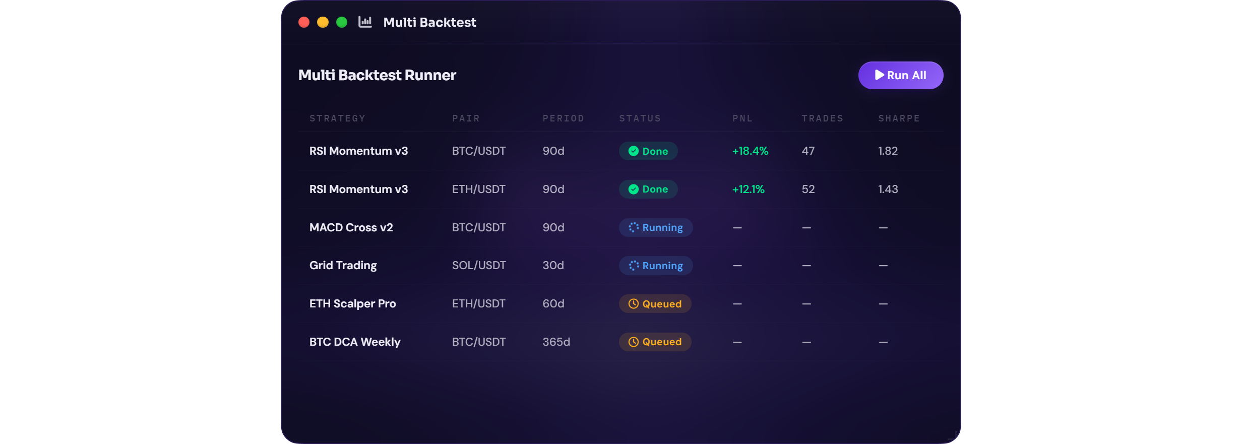 This opens up concrete possibilities: testing a strategy across multiple time periods to verify it holds up over time, validating it on several pairs or assets simultaneously, or comparing multiple configurations of the same system in a single run.