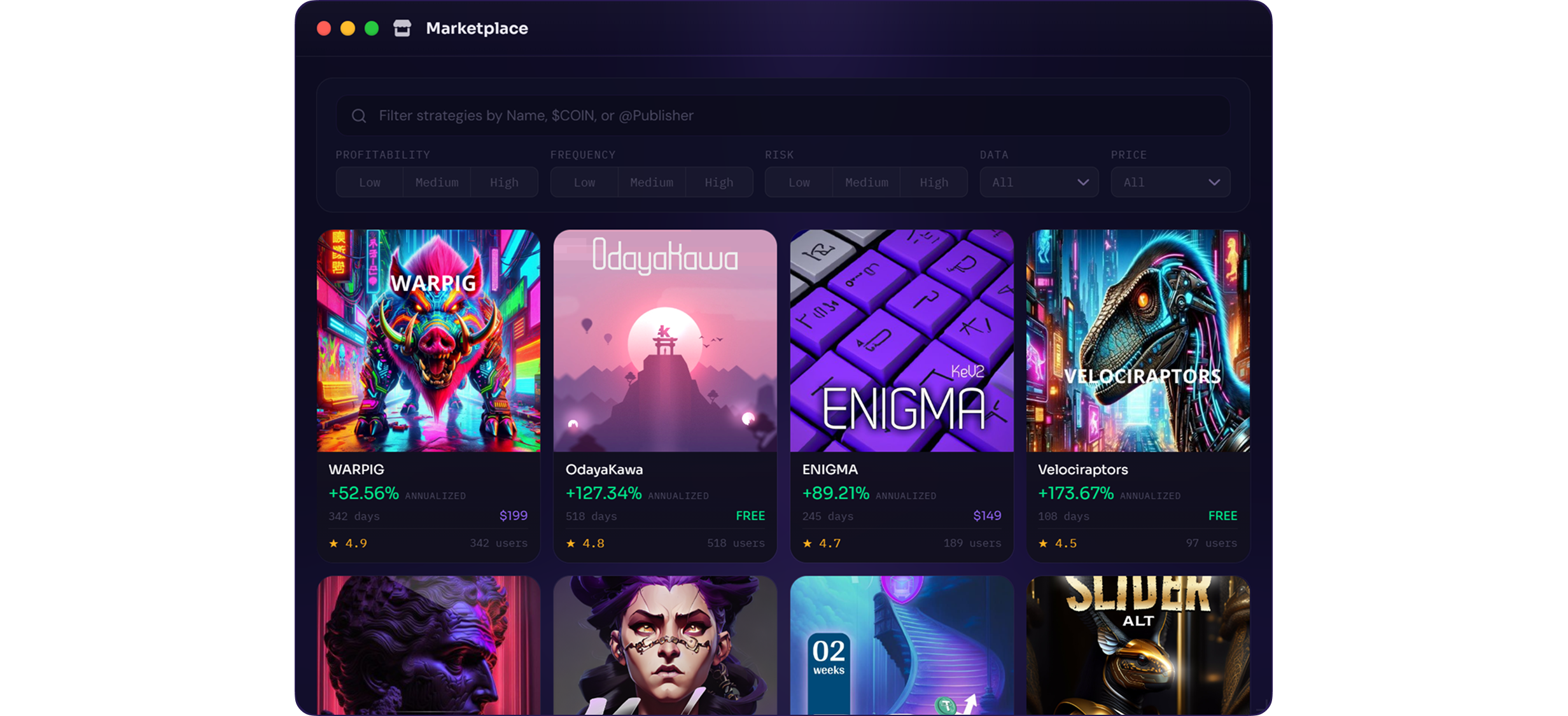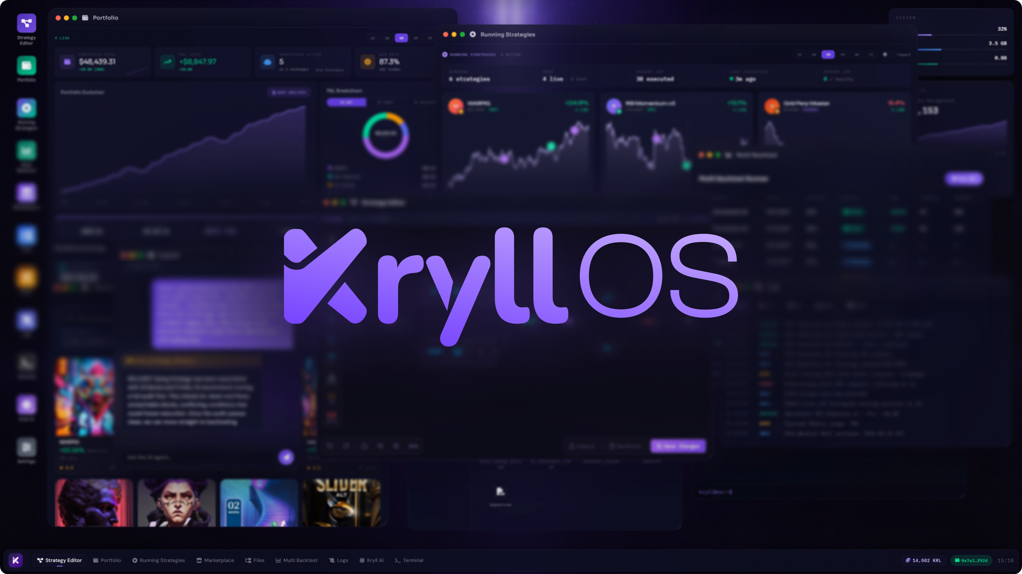 In practice, KryllOS behaves like a complete desktop environment. Open the strategy editor in one window, a real-time performance dashboard in another, the marketplace in a third, and run multiple backtests in the background. Each window is independent, repositionable, and you compose your own workspace to match your trading style.
