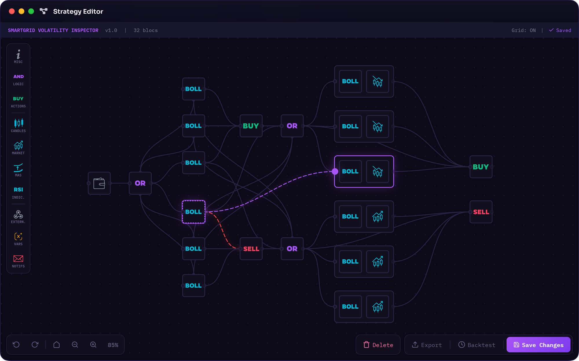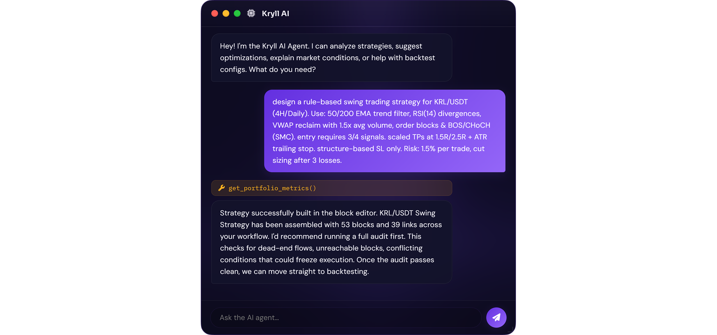Describe what you want in plain language. "I want a strategy that buys when the RSI drops below 30 and the MACD crosses upward, with a 5% stop-loss." The AI automatically generates the corresponding blocks in the editor. The process is conversational: you refine, iterate, and adjust until you get exactly what you want.