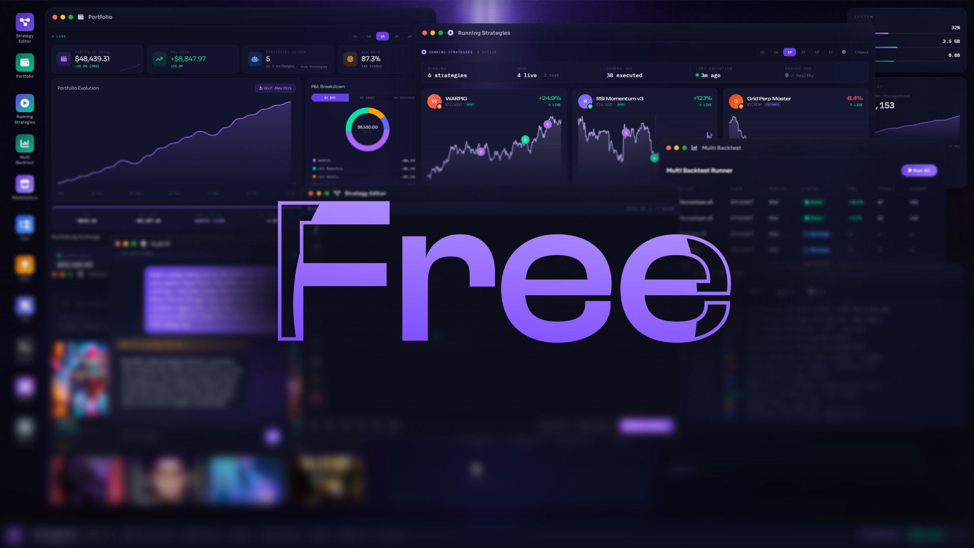 The software runs on your machine. Your API keys stay there. Your capital never passes through our servers at any point, and we have no access to your funds. Charging a commission on your transactions would be technically impossible for us. The profits generated by a strategy therefore come back to you in full, and this doesn't depend on any decision on our part, it is the product's architecture that guarantees it.