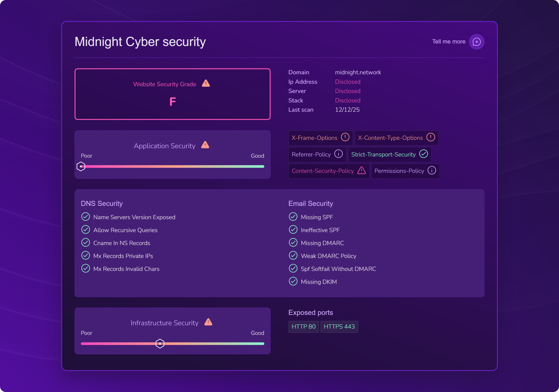 👉 In simple terms: Midnight's cybersecurity is clearly insufficient with an F rating. The exposure of the IP address, server, and stack greatly facilitates malicious reconnaissance and opens the door to targeted attacks. The three major identified vulnerabilities directly expose users to clickjacking attacks, execution of malicious scripts, and injection of dangerous content. For a project that places privacy and security at the heart of its value proposition, this is deeply paradoxical and unacceptable. These critical flaws must be urgently corrected before any serious adoption.