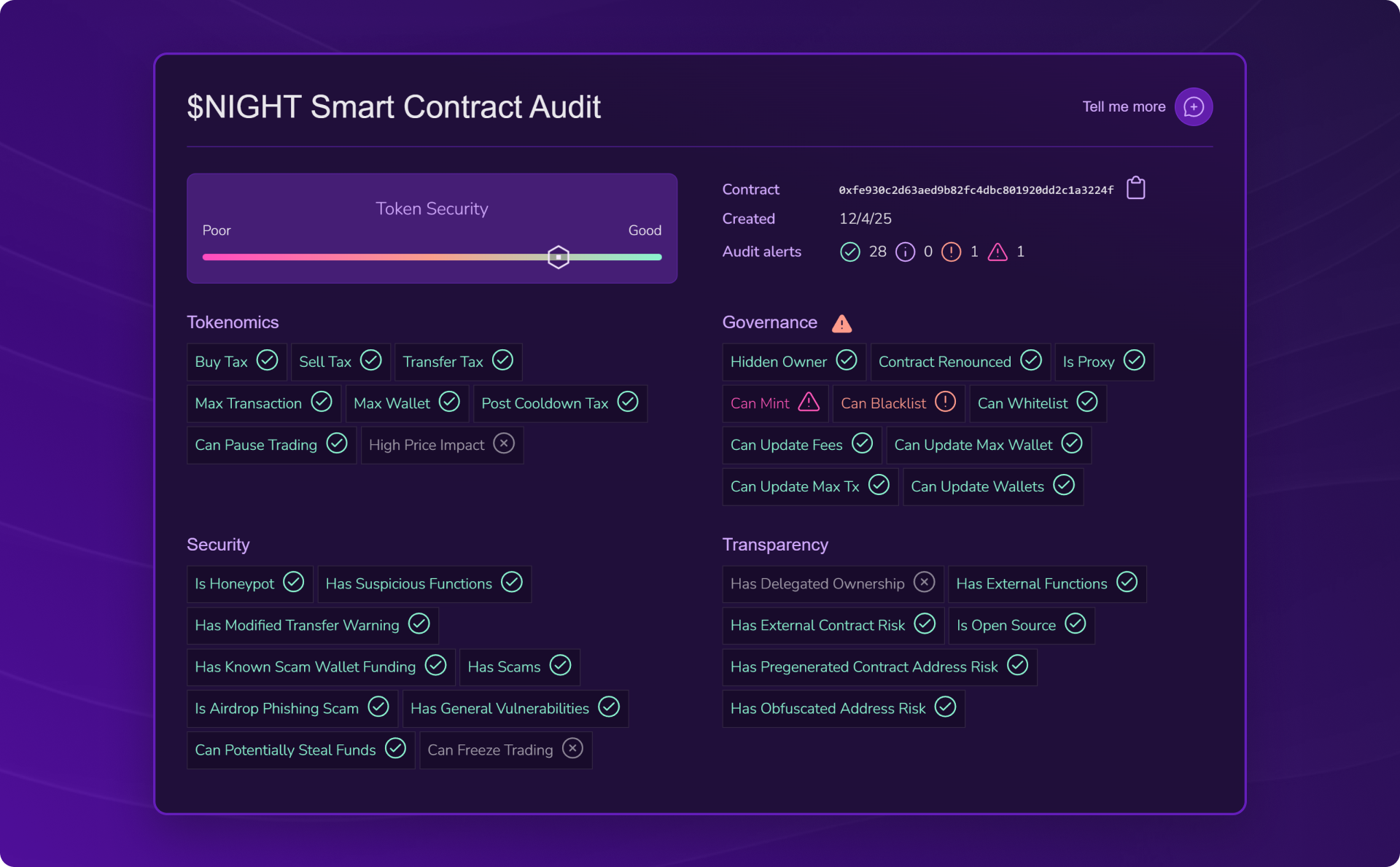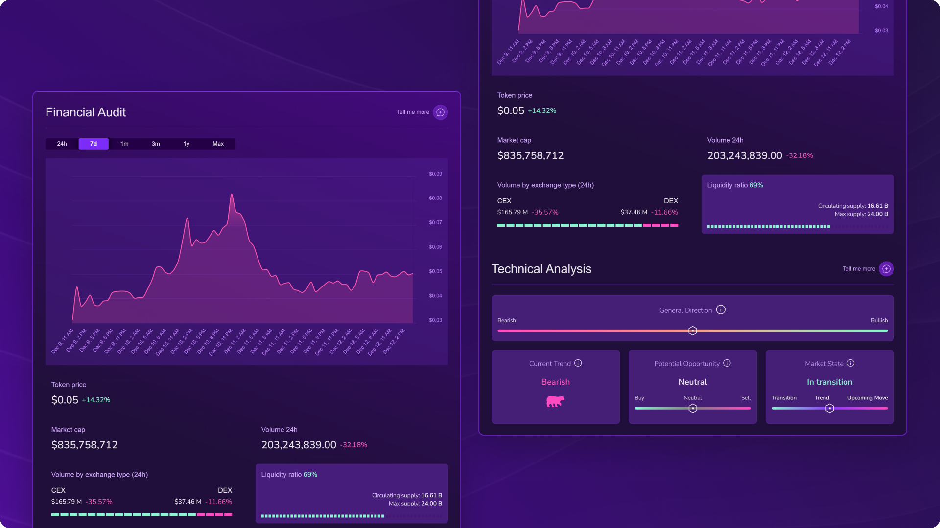 - ⚡ Instant complete audit: Get a clear overview of a token in seconds: smart contract, on-chain data, financial metrics, and social signals all in one place.
