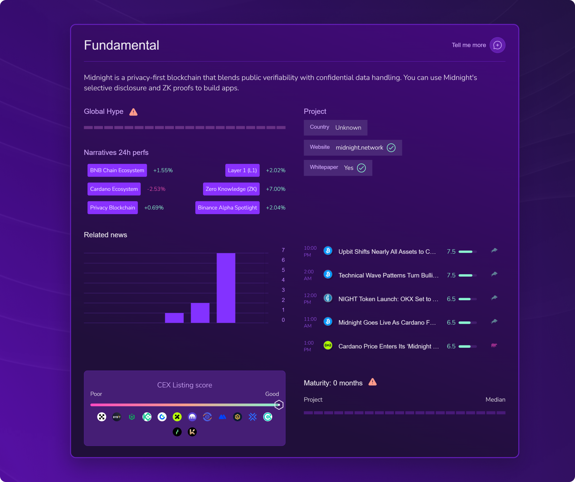 👉 To explain simply: Midnight is an extremely recent project (launched in December 2024), which explains its 0-month maturity. Despite this, the fundamental score of 64 is encouraging for such a recent launch. The presence of a whitepaper and median CEX listing show a structured approach, even if the project still needs to prove itself over time. Charles Hoskinson's backing and strong narratives (privacy blockchain, ZK proofs) partially compensate for the lack of history.
