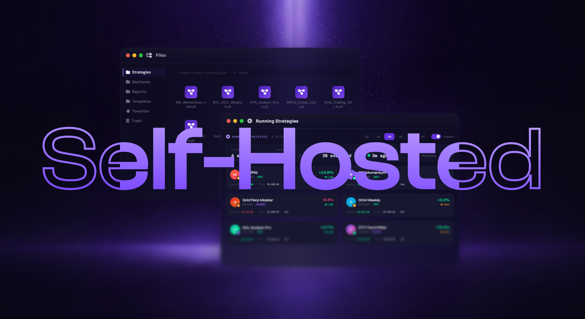 Your strategies, your performance, your trade history, everything stays local. No data is sent to an external service.