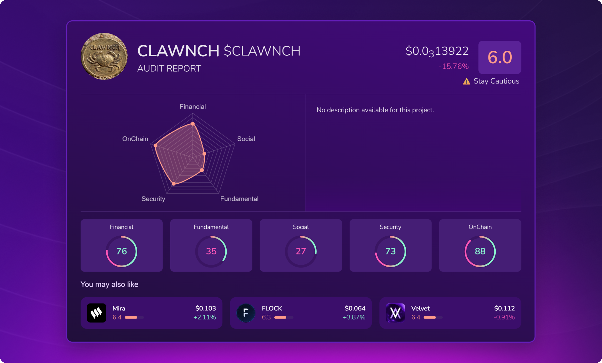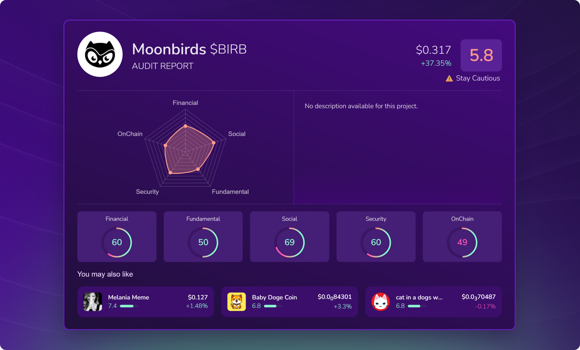 - ⚡ Instant complete audit: Get a clear overview of a token in seconds: smart contract, on-chain data, financial metrics, and social signals all in one place.