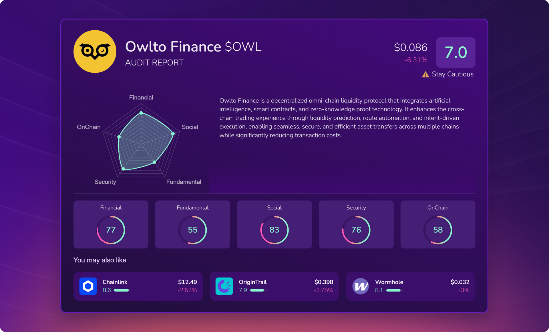 X-Ray Analysis: Owlto displays an overall balanced profile. Strong financial and social scores reflect solid traction and genuine community interest. Fundamentals and on-chain activity remain more moderate, suggesting a phase of technological consolidation, while security shows a reassuring technical foundation for an infrastructure protocol.
