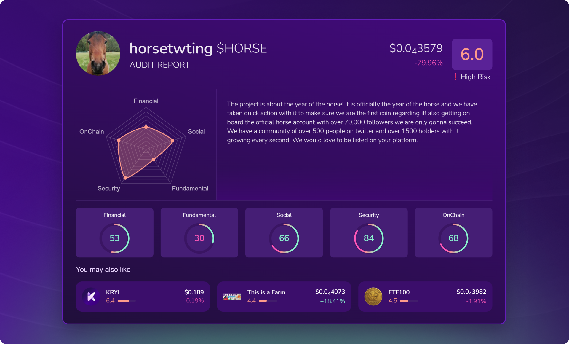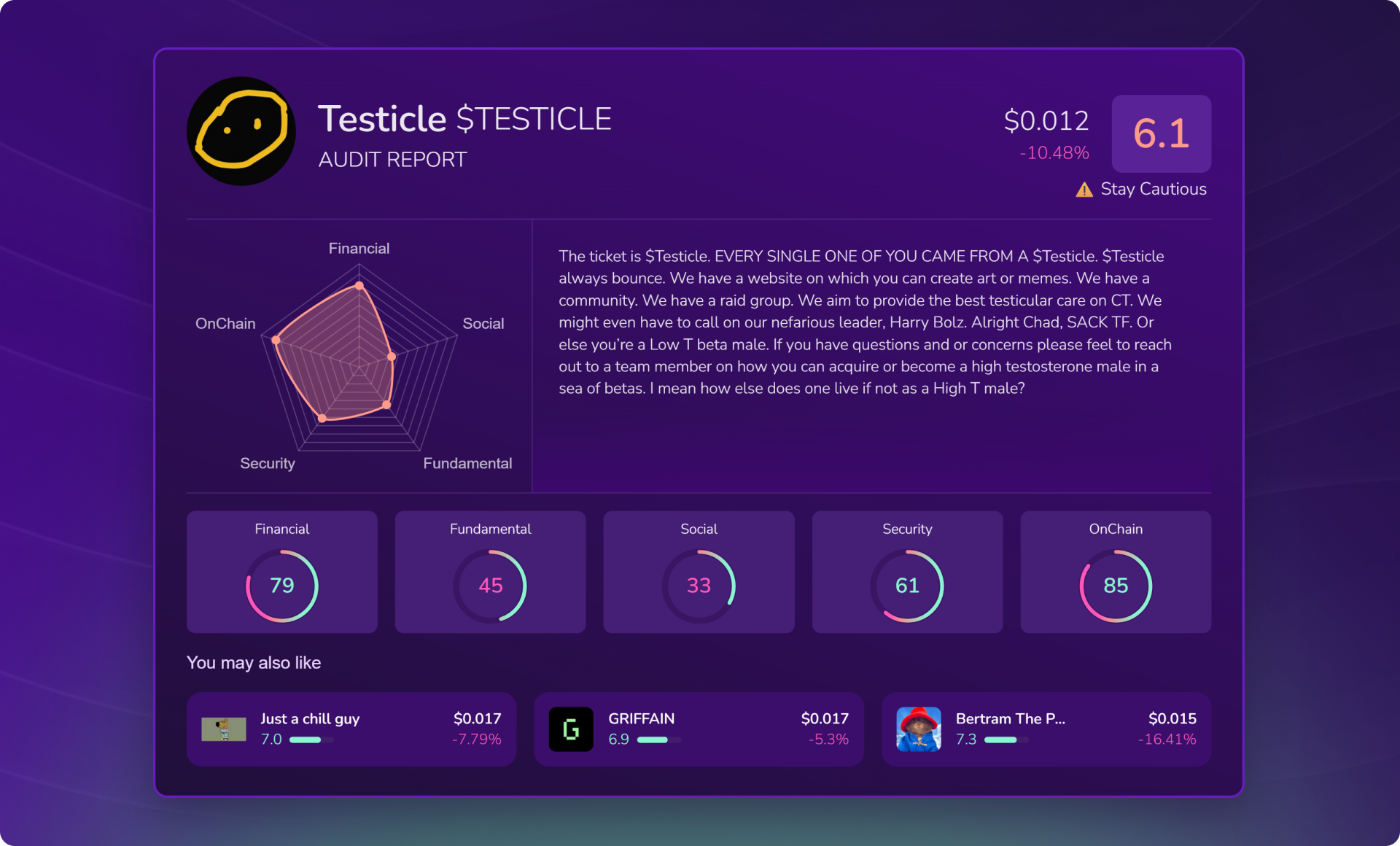 - ⚡ Instant complete audit: Get a clear overview of a token in seconds: smart contract, on-chain data, financial metrics, and social signals all in one place.