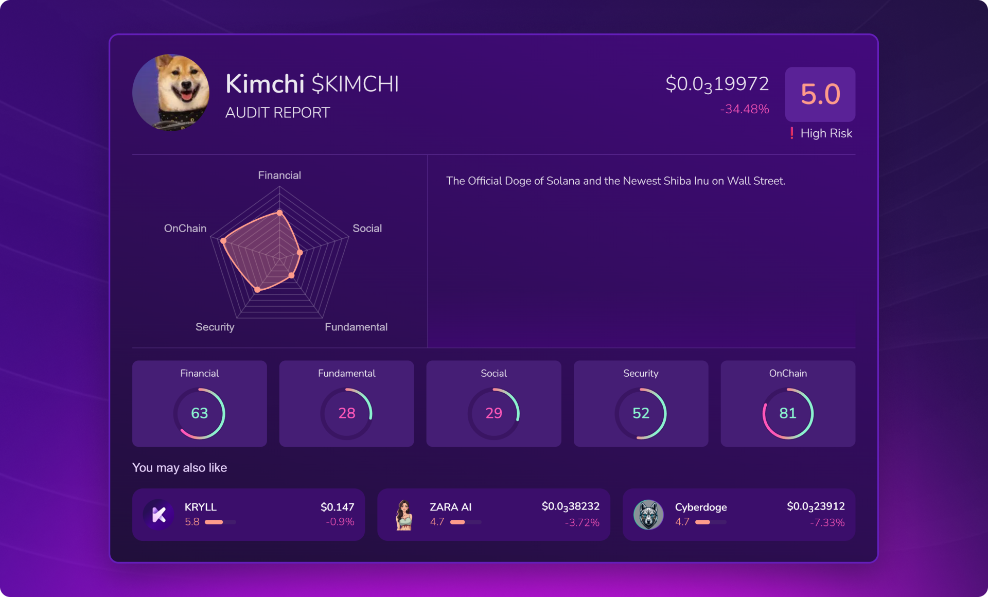 X-Ray Analysis: $KIMCHI shows high on-chain activity (81) and solid financial metrics (63), which may reflect a certain level of usage and liquidity relative to its market cap. However, signals remain mixed on fundamentals (28) and social (29), while security (52) sits in a mid-range zone—worth monitoring in a fast-moving memecoin environment.