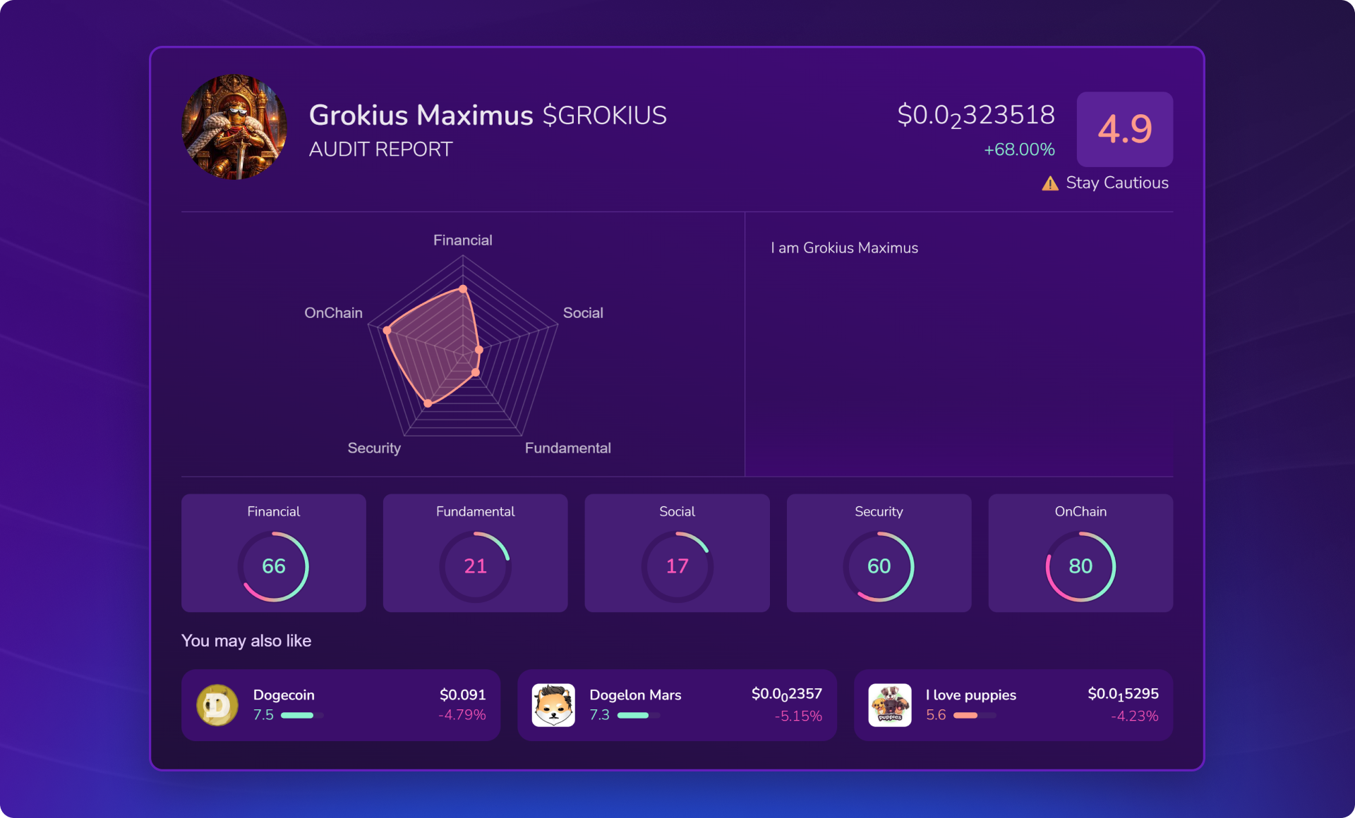 - ⚡ Instant complete audit: Get a clear overview of a token in seconds: smart contract, on-chain data, financial metrics, and social signals all in one place.