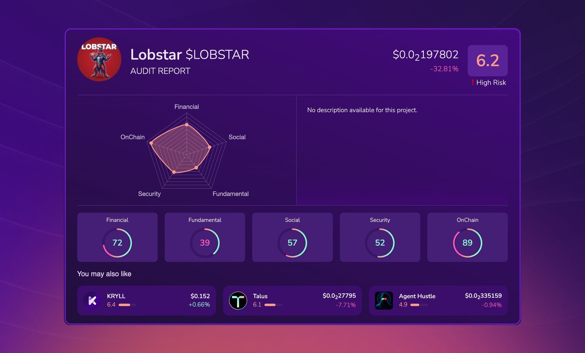 - ⚡ Instant complete audit: Get a clear overview of a token in seconds: smart contract, on-chain data, financial metrics, and social signals all in one place.