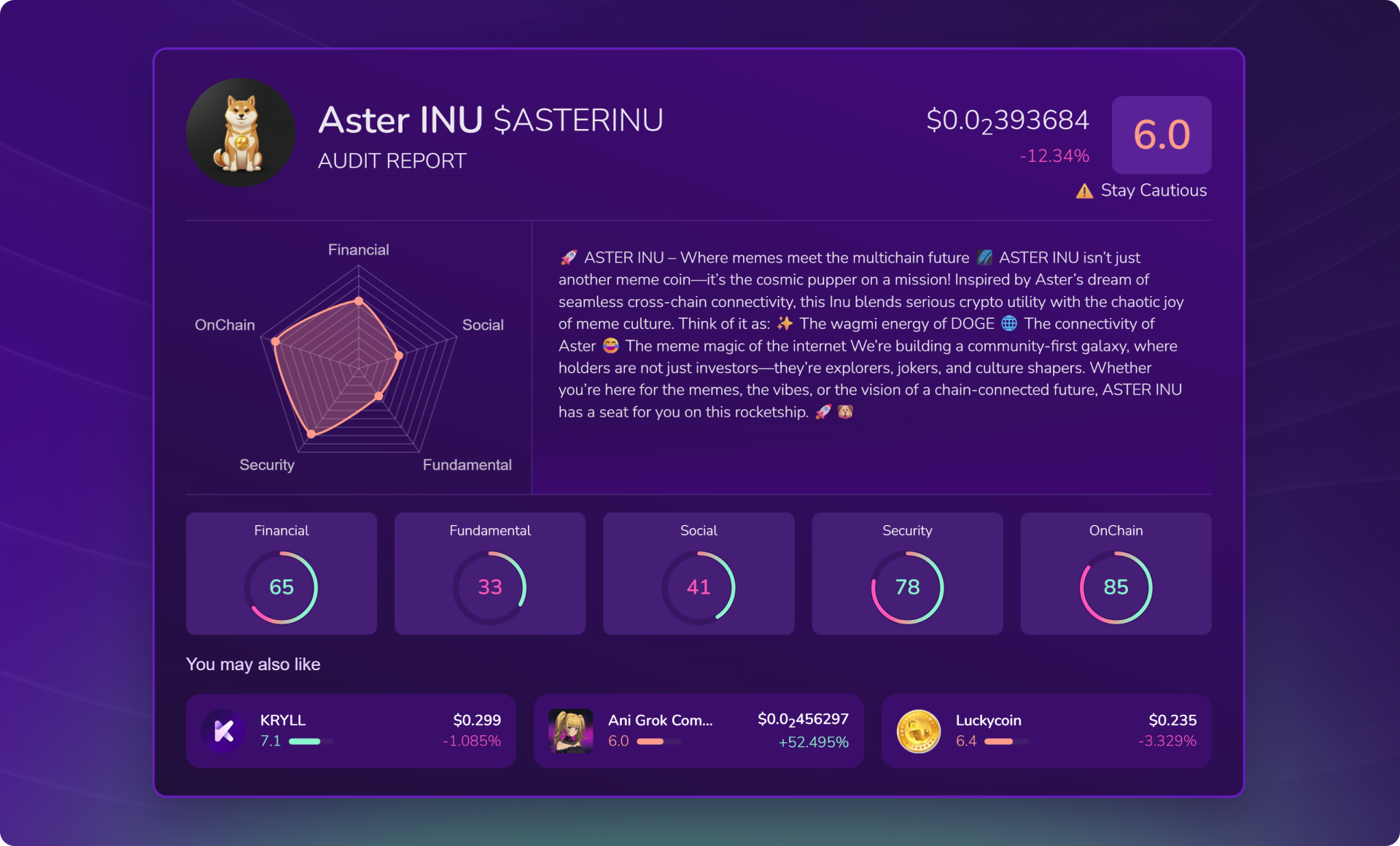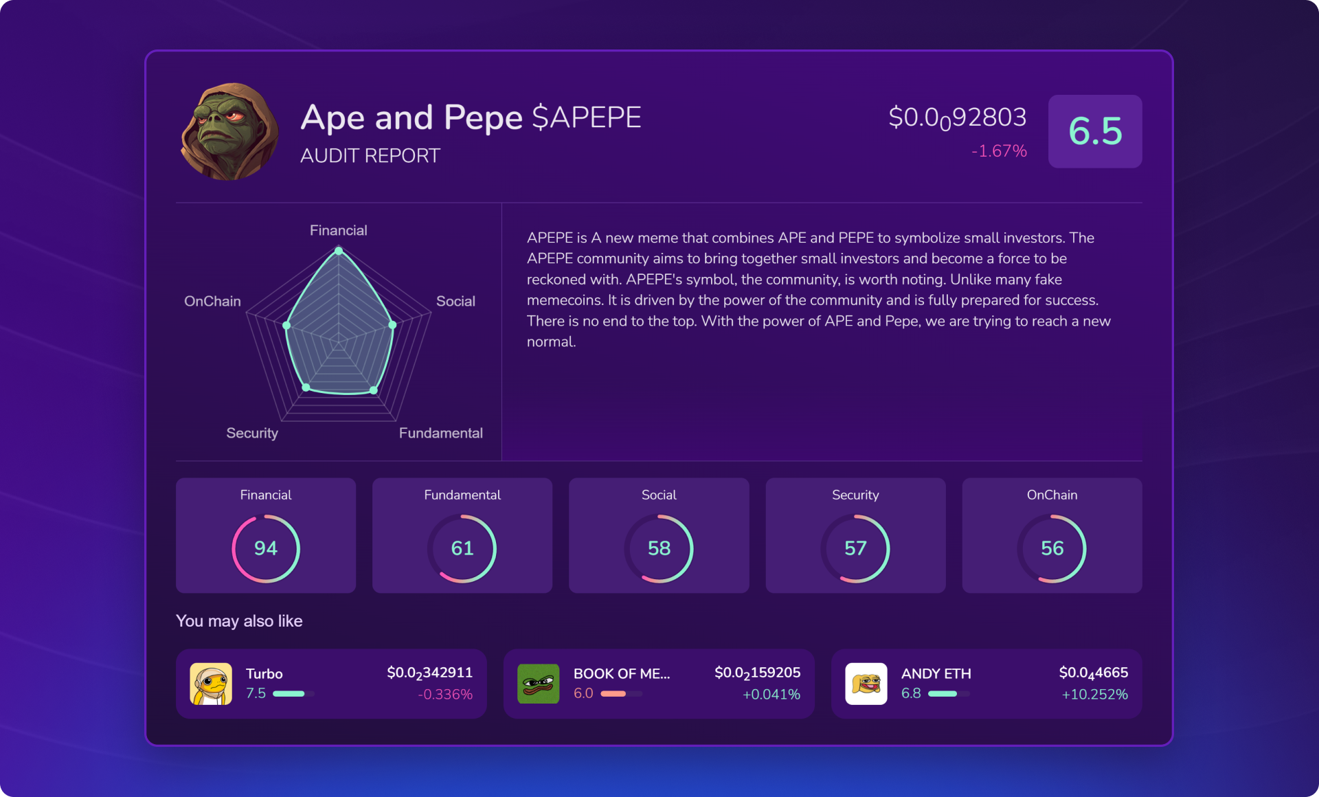 - ⚡ Instant complete audit: Get a clear overview of a token in seconds: smart contract, on-chain data, financial metrics, and social signals all in one place.