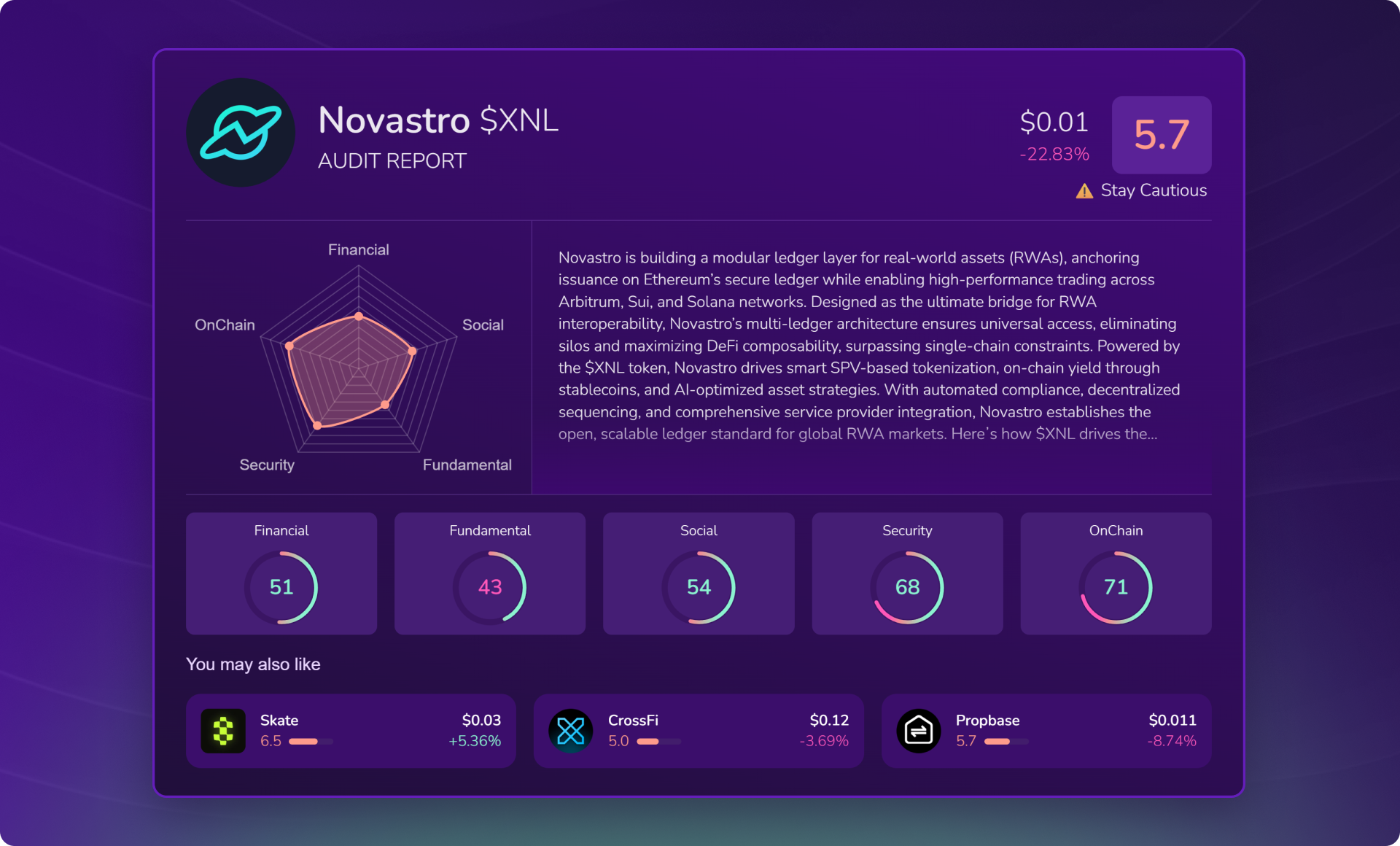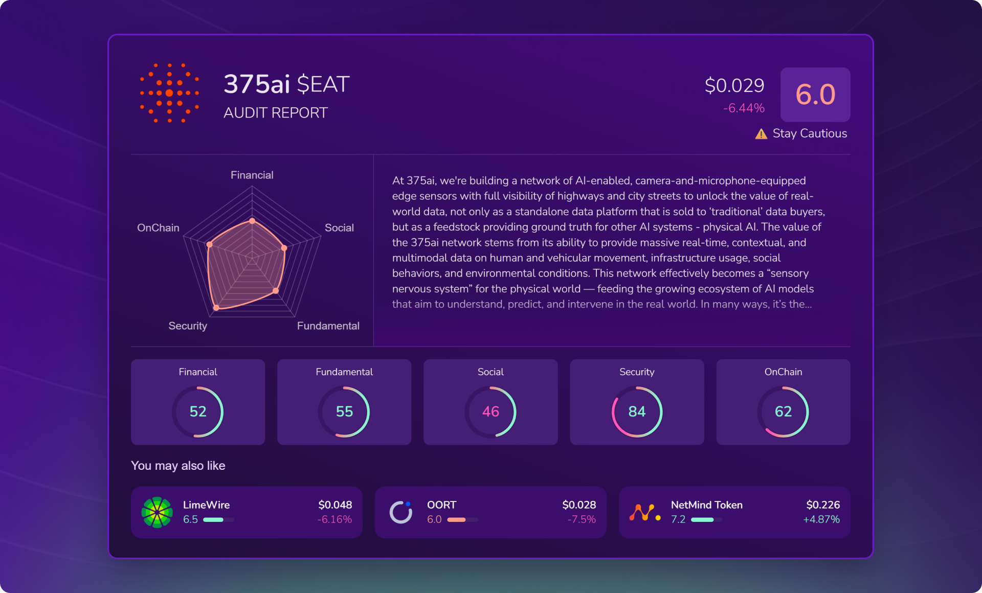 - ⚡ Instant complete audit: Get a clear overview of a token in seconds: smart contract, on-chain data, financial metrics, and social signals all in one place.