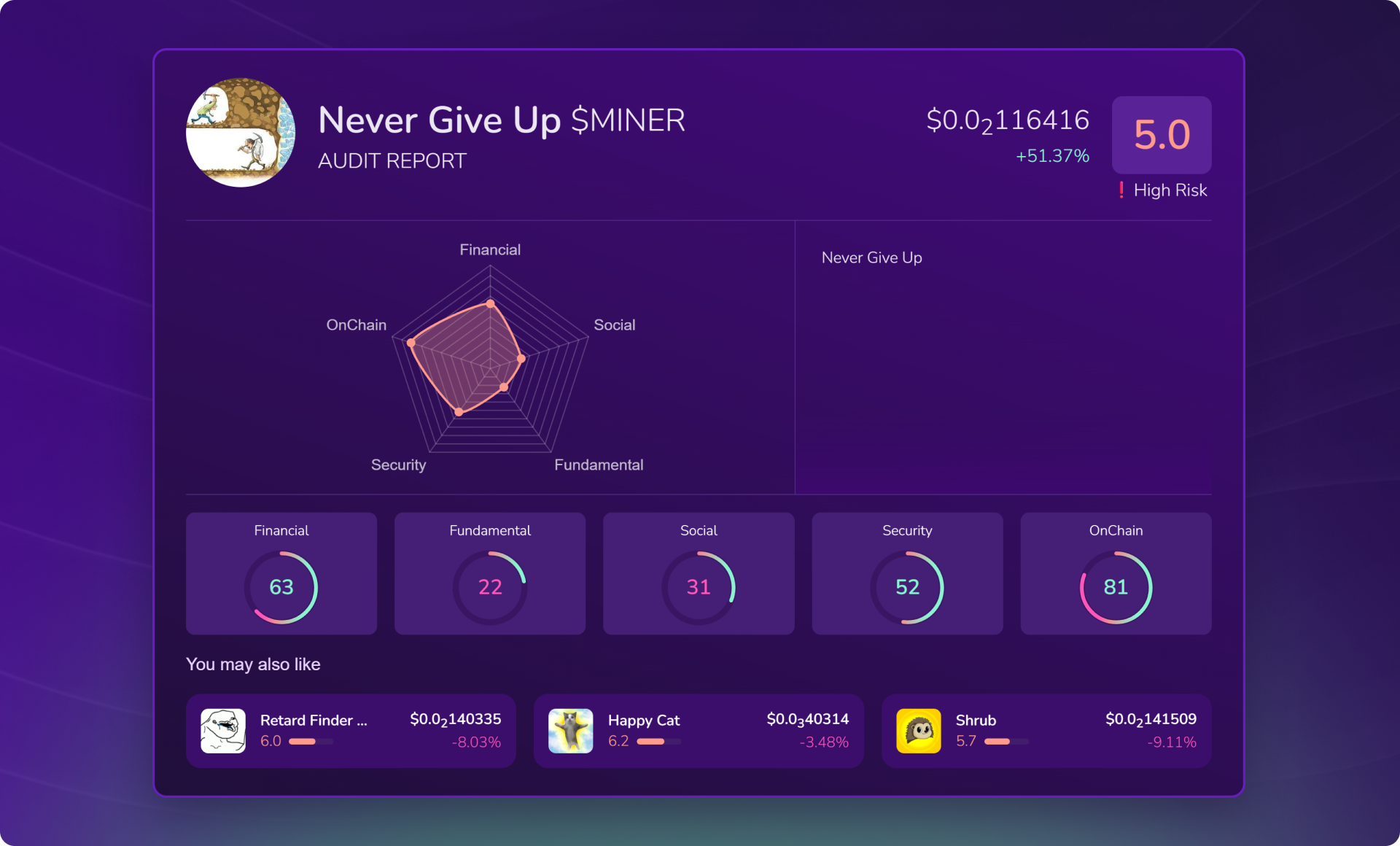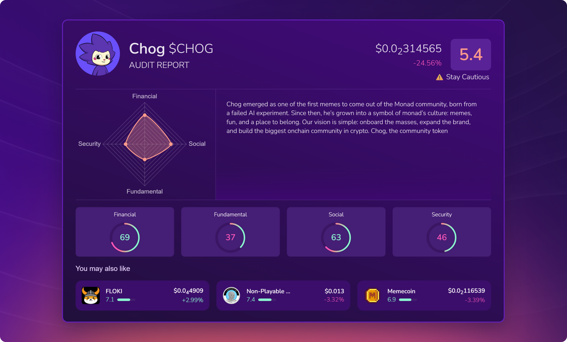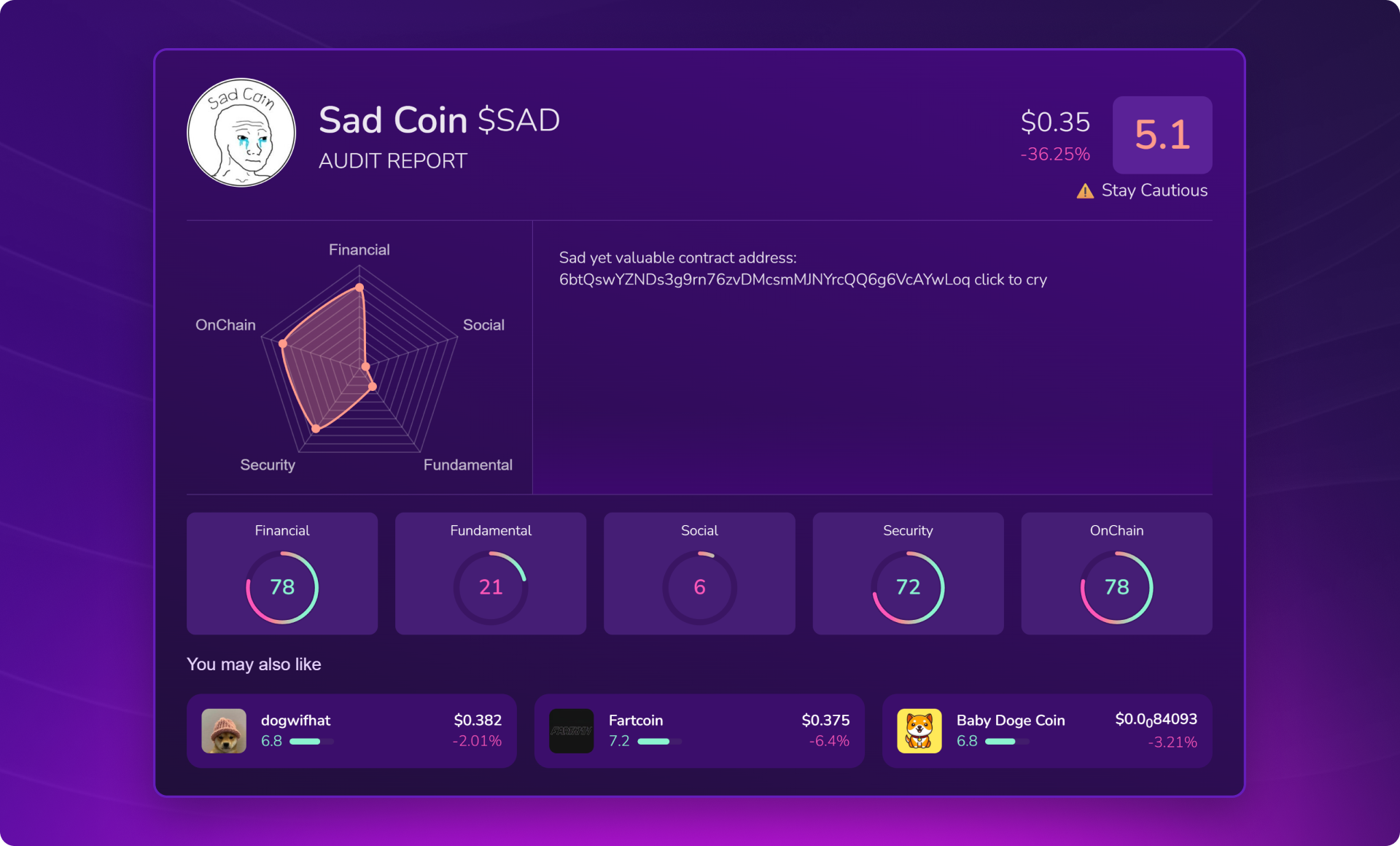 - ⚡ Instant complete audit: Get a clear overview of a token in seconds: smart contract, on-chain data, financial metrics, and social signals all in one place.
