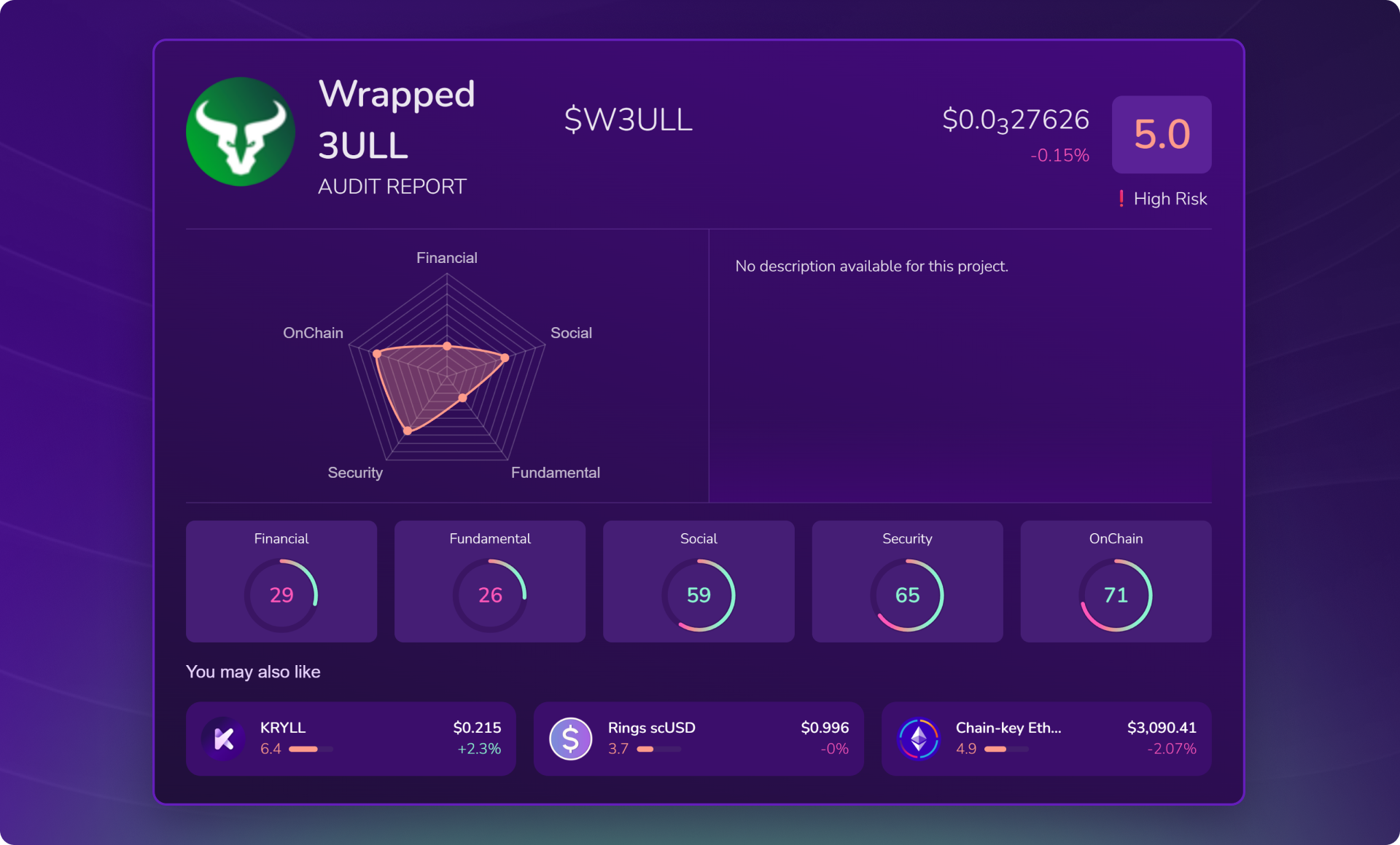 Every week, Kryll X-Ray analyzes hundreds of new tokens based on over 100 different criteria: financial data, fundamentals, on-chain activity, security, social influence, and much more. These automated, independent, and objective audits allow us to paint a precise picture of the health and potential of each project.